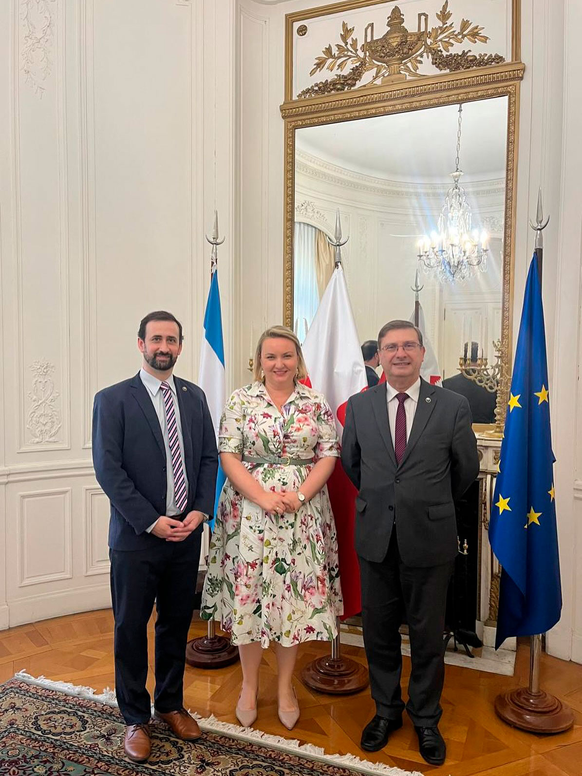 Reunión en la Embajada de la República de Polonia en Buenos Aires. Desde la izq, hacia la der. están el Secretario de Relaciones Internacionales, Abog. Federico Giacopazzi, la Encargada de Negocios en la Embajada de Polonia, Bogna Rominowicz y el Rector de la Universidad FASTA, Dr. Juan Carlos Mena. Fot. Instagram.embajadaplenarg
