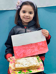 El miércoles, los niños deberían traer una receta típica de su familia que identifique. Podía incluir el nombre del plato, los ingredientes, anécdotas y fotografías para compartir con sus pares. Y el viernes se realizaría la feria, por lo cual, deberían traer la comida que previamente escogieron. Imaginen lo feliz que estaba Leonela de representar a Polonia. Ah, y la szarlotka estaba deliciosa, para chuparse los dedos. ¡Felicitaciones!
