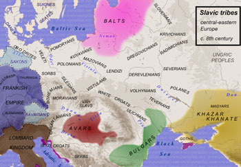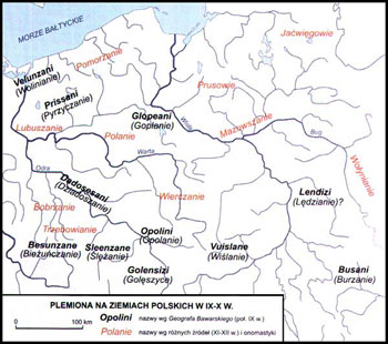 A principios del siglo IX, en la "Descripción de los poblados fortificados al norte del Danubio", de la autoría del Geógrafo de Baviera ,alrededor del año 850, ya aparecen los nombres de tribus concretas que habitaban las cuencas del Vístula y del Oder: goplanos (Goplanie), dziadosanos (Dziadoszanie), slezanos (Ślężanie), bobrzanos (Bobrzanie), opolanos (Opolanie), vislanos (Wiślanie) y ledzanos (Lędzianie). Las ciudades situadas a lo largo de las rutas comerciales florecían gracias a los continuos contactos comerciales. Debido a los conflictos militares, las fortificaciones crecían a su alrededor y aumentaba la importancia primero del jefe y luego del caudillo tribal. Este fenómeno se destacó de un modo especial en los territorios de la Polonia Mayor, donde la tribu de los polanos pronto consiguió la posición dominante y hacia la mitad del siglo X comenzó su expansión hacia el Este: Mazovia y hacia el Oeste: Región de Lubusko y Lusacia (Łużyce). Los polanos iban sometiendo sucesivamente las tribus eslavas vecinas, llegando a crear un compacto estado con un ágil sistema administrativo. Algunos de ellos se desarrollaron y fueron habitados, otros tenían un gran espacio vacío y pueden haber servido como refugios durante tiempos de conflicto. Los polanos habitaron las llanuras alrededor de Giecz, Poznań y Gniezno, lo que finalmente llegaría a ser el centro del nuevo estado, dando lugar al nombre del país. Durante el comienzo del siglo X, dando lugar a Polonia. |