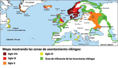 Vikingo es el nombre dado a los miembros de un grupo étnico originario de Escandinavia, de los países nórdicos (Dinamarca, Noruega y Suecia) que vivió entre los años 789 y 1100. Fueron descendientes de un pueblo de origen germánico que se estableció en la península escandinava hacia el año 2000 a. C.. Los escandinavos eran considerados durante los siglos VI-XI un pueblo primitivo y guerrero. Las duras circunstancias de la vida, la falta de recursos y la expansión demográfica, hicieron que grupos de hombres abandonaran sus tierras y empezaran a explorar nuevos horizontes hacia el año 856. Por ello, los primeros vikingos deseosos de conocer rutas, hallaron el norte de Escocia y posteriormente Irlanda en la que si se encontraron con un pueblo mucho más culto, los celtas. Arrasaron con todo y creándose el apodo de piratas o reyes del mar “Vikinger”. A veces eran ladrones, saqueadores, asesinos y otras veces eran comerciantes. Saquearon las tierras del norte, Germania, Rusia, Países del Mar Báltico, Países Bajos, Galia, la Normandía, la Bretaña e incluso el norte de la península de Hispania (desde Galicia hasta Vascongadas, destacando la zona del cantábrico occidental), Italia e incluso se asegura que llegaron hasta Bizancio. La Era Vikinga termina en 1100 cuando Suecia se convierte al cristianismo. Ese mismo año acaban las incursiones vikingas. Aun así, los descendientes de los vikingos lograron consolidarse en el ámbito europeo y fundaron el primer reino ruso en Kiev. Los normandos, vikingos asentados en Francia, salieron de Normandía y subieron a los tronos del reino de Jerusalén, Inglaterra, Sicilia, Nápoles y del Imperio Latino. |