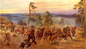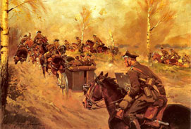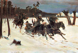 | La persecución de los Lanceros a los bolcheviques en un trineo. (Jerzy Kossak). | Escaramuza con los cosacos en el pozo. (Jerzy Kossak). | Brigada de artillería llega a la posición. (Jerzy Kossak). |