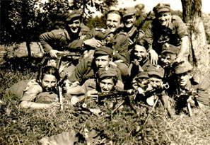 Mayo de 1945. Soldados de Acción de Emergencia Especial (PAS) de las Fuerzas Armadas Nacionales (NSZ) de Distrito Lublin de la agrupación de Mieczyslaw Pazderski "Szary" (sentado en la fila del medio, arriba de soldado con MP-40). En la fila superior, segundo desde la izquierda, se encuentra Stanislaw Kuchciewicz apodo "Viktor". |