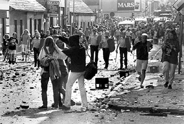Lo mismo se hizo con otros eventos musicales de este tipo. Según los investigadores del Instituto de la Memoria Nacional, una de las formas de pacificar los festivales fueron las actuaciones de bandas conocidas y aceptadas por las autoridades. Sin embargo, cuando en uno de esos eventos Lombard, Republika y Wanda se negaron a tocar, como resultado de la represión no se les permitió viajar al extranjero y se restringió la transmisión de sus obras por radio y televisión. Los escritores y poetas rebeldes fueron tratados de manera similar. Fueron privados de las becas creativas, no se entregaban pasaportes, se reducía la circulación de los libros o se prohibía completamente su publicación. Y si aparecían milagrosamente, las bibliotecas recibían instrucciones de no venderlos. En la República Popular de Polonia, este trato fue experimentado por muchos escritores con mentalidad de oposición, por mencionar solo a Paweł Jasienica, Tadeusz Konwicki o los poetas de Nueva Ola de finales de los años sesenta y setenta, incluidos Adam Zagajewski y Stanisław Barańczak. En casos extremos, caer en manos del poder significó no solo una falta de medios para vivir, sino también la desaparición de la circulación pública. | Jarocin 1994. Los punks contra el Servicio de Seguridad. La ciudad fue demolida. La próxima edición de Jarocin tuvo lugar 10 años después. |