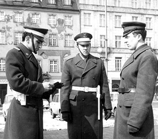 El servicio militar obligatorio también amenazó a Krzysztof Klenczon, pero su padre, utilizando sus contactos en WKU, organizó un aplazamiento para él. Más tarde un médico le otorgó la categoría de salud D, que lo eximió del servicio militar. No hace falta comentar que el joven músico disfrutaba de una gran salud. "Mi suegro tenía amplios contactos. Conocía al jefe del hospital, farmacéutico, secretario del partido. Krzysztof chantajeaba a su padre diciéndole que si lo llevaban al servicio militar, se suicidaría", revela la esposa del artista en el libro. Pero no se salvó Jerzy Kossel, de grupo Niebiesko-Czarni, quien tuvo que cumplir el servicio militar obligatorio de dos años en el "popular" Ejército Polaco (como bibliotecario, pero aun así). Un método eficaz de chantajear a los artistas de la República Popular de Polonia eran las actividades que influían en su estado material. En aquellos días, escritores, poetas, pintores y músicos dependían prácticamente de una olla estatal. Cuando las autoridades decidieron que el creador no se estaba comportando correctamente, coloquialmente hablando, le vaciaban el bolsillo. A los músicos se les prohibió actuar o, en una versión más suave, se les prohibió participar en lucrativos conciertos en el extranjero. No se permitió la publicación de discos o su circulación se redujo drásticamente, se bloqueó la transmisión de canciones por radio y televisión y se prohibió la publicación de entrevistas. | Control. Una Patrulla del Servicio de Control del Departamento de Prevención de los Servicios Internos Militares (hoy se llamaría Gendarmería Militar) controla a un soldado del servicio regular y obligatorio. |