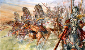 | Resumen: Los Húsares Alados Polacos (evolución del húsar húngaro): una de las unidades de caballería más legendarias y bellas de todos los tiempos. Los más característicos de estos lanceros además de sus capas de leopardo eran sus alas: "Consistían éstas en bastidores verticales forrados de terciopelo escarlata en los que se engastaban plumas de águila." Parece que su sentido va más allá de lo decorativo. Lazos como los de los poderosos tártaros no llegaban a su garganta, sino a sus alas y el ruido de las plumas con el viento atemorizaba a sus enemigos. Estos guerreros fueron determinantes en la victoria en Viena en 1683. y marcaron el fin de 250 años de amenaza musulmana sobre la Europa cristiana. Por su resistencia ante la invasión Islámica se ganaron el título de “Antemurale Christianitatis”. |