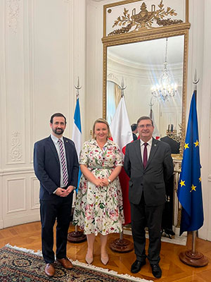 Reunión en la Embajada de la República de Polonia en Buenos Aires. Desde la izq, hacia la der. están el Secretario de Relaciones Internacionales, Abog. Federico Giacopazzi, la Encargada de Negocios en la Embajada de Polonia, Bogna Rominowicz y el Rector de la Universidad FASTA, Dr. Juan Carlos Mena. Fot. Instagram.embajadaplenarg
