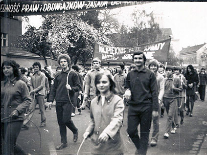 Entonces se puede decir que no hay manifestación más hermosa de identidad nacional que el despliegue de símbolos que nos han acompañado durante siglos. Símbolos que están profundamente arraigados en nuestros corazones desde el nacimiento hasta la muerte. El joven de la fotografía, en el primer plano de la derecha, es el que escribe. La foto tomada en 1974. Un grupo de estudiantes de la secundaria, parecen deportistas, manifestando su lealtad a los gobernantes comunistas. En verdad fuimos obligados presentarse a esta manifestación del 1 de Mayo. Nos entregaron objetos de gimnasia artística que nunca tuviéramos en la mano. De todos nosotros que aparecen en la foto me parece que el único era yo que tenía que ver algo con el deporte. La propaganda se fue a los medios y Nowa Sól, como tantas otras ciudades en Polonia cumplieron su rol de lealtad a PZPR. |