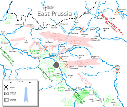 Batalla de Varsovia (1920)La Historia RealLa Batalla de Varsovia (a veces llamada Milagro en el Vístula; en polaco: Cud nad Wisłą) fue el enfrentamiento decisivo de la guerra polaco-soviética, la cual había empezado en 1918 poco después del fin de la Primera Guerra Mundial y concluyó con el Tratado de Riga en 1921. La Batalla de Varsovia se desarrolló en 1920 desde el 13 de agosto hasta el 25 del mismo mes. Comenzó cuando las fuerzas del Ejército Rojo, comandadas por Mijaíl Tujachevski, se aproximaron a la capital polaca de Varsovia y a las cercanías de la fortaleza de Modlin. Pese a que en un principio las tropas rusas parecían estar ganando la batalla, realmente estaban cayendo en la trampa preparada por el gobierno polaco. El 16 de agosto, fuerzas polacas dirigidas por Józef Piłsudski contraatacaron desde el sur a los puntos débiles del frente soviético, forzando contra todo pronóstico a las fuerzas rusas a retirarse en forma desorganizada hacia el este y detrás del río Niemen. |