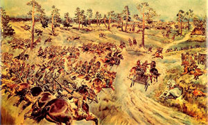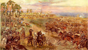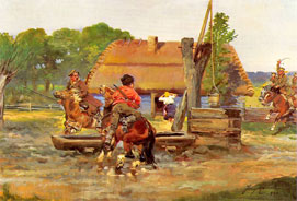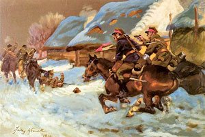 | La persecución de los Lanceros a los bolcheviques en un trineo. (Jerzy Kossak). | Escaramuza con los cosacos en el pozo. (Jerzy Kossak). | Brigada de artillería llega a la posición. (Jerzy Kossak). |
