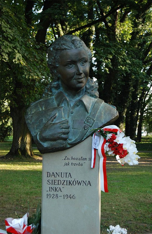 A la menor la mató un oficial de UB con un disparo a la cabeza. Adolescente de diecisiete años se negó firmar una petición de clemencia al Bierut (jefe del estado polaco comunista entonces) impuesta sobre ella por un defensor público, donde estaban insultos a su rama. Unos días antes de su muerte escribió un mensaje secreto enviado desde la cárcel: "Dile a mi abuela, que me comporté como debía"... Fue escrito a su abuela, porque la madre fue asesinada por la Gestapo en Białystok y al padre, soviéticos deportaron a Siberia... Una de las más impactantes, conmovedoras, pero constructivas historias de la guerra y de la realidad de la posguerra. La historia de una joven enfermera de AK, Danka Siedzikówna "Inka" documentada en un libro, a ningún lector le pasará desapercibido. |