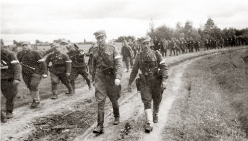 1944, en la región de Vilna. El Sargento Mayor Antoni Rymsza “Maks”, comandante del 3 Escuadrón 5ª Brigada de Wilna del Ejército Nacional (AK), junto con el subcomandante Jan Kursewicz “Akacja” marchan en fila al lado de los soldados. |