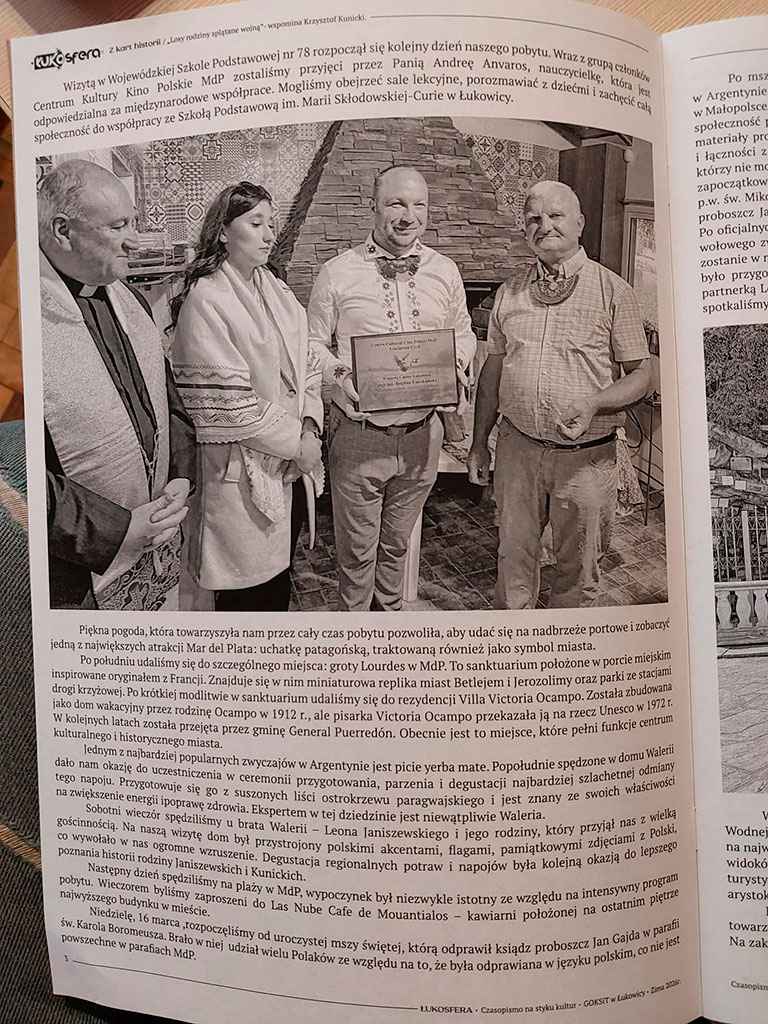 Nuestra visita trajo consigo otros beneficios tangibles: se establecieron contactos entre municipios, escuelas y la parroquia, y se fortalecieron las relaciones con la comunidad polaca, que expresó su disposición a participar activamente en los eventos organizados por la Comuna de Łukowica. Se reforzó la imagen positiva de nuestra comuna en el exterior. A nivel personal, se renovaron los lazos familiares, que tienen el potencial de desarrollarse y dar lugar a relaciones duraderas entre descendientes de antepasados comunes. Nuestra estadía en Mar del Plata transcurrió en un ambiente de extraordinaria cordialidad. Nuestros anfitriones argentinos nos brindaron una inmensa hospitalidad, tanto en eventos oficiales como en momentos más informales. Agradecemos especialmente a Józef Stawecki, presidente del Centro Cultural Cine Polaco MdP, y a los demás miembros de la Asociación: Marta Depinski, Valeria Janiszewski, Javier Gómez, Teresa Wilczynski, Eduardo Román Szokala, María Elena Jachewicz, Pablo Solodki, Mariana Solodki y a todos los demás miembros por organizar y atendernos durante nuestra visita. Estas experiencias nos dejaron, al salir de Mar del Plata, con un sentimiento de gratitud y un fuerte vínculo con la comunidad local. Esta visita demostró la importancia de las relaciones internacionales y los contactos con la diáspora polaca, y sus efectos y consecuencias se sentirán durante muchos años.