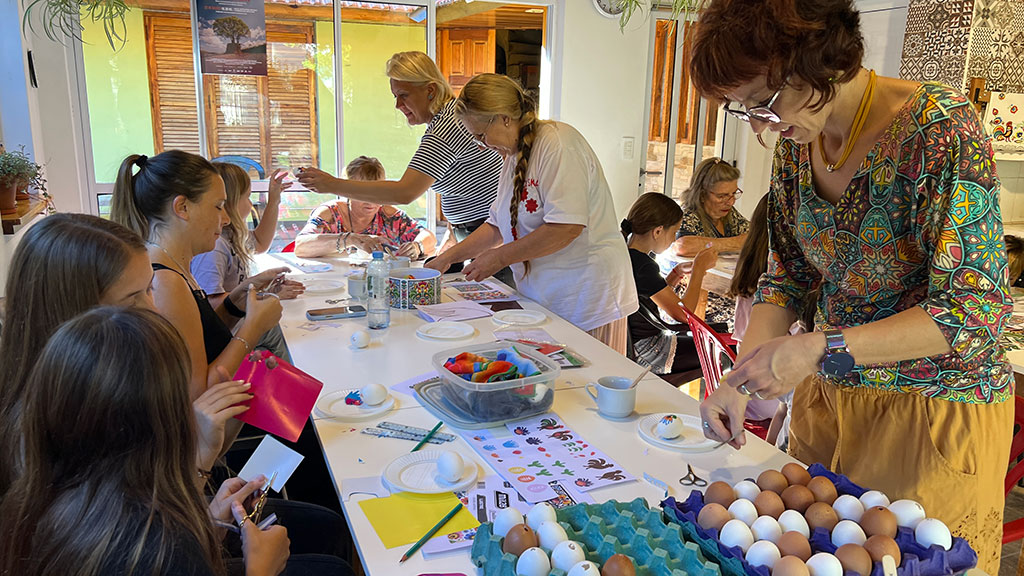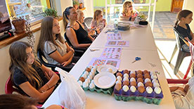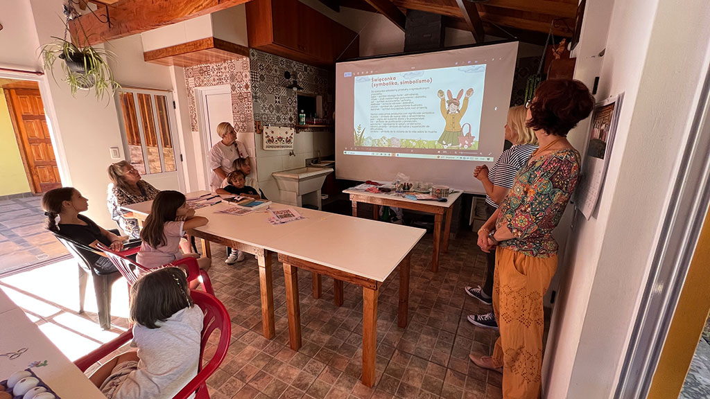 En el comienzo, los participantes, niños, adolescentes y mayores, conocieron las diferentes técnicas para decorar huevos de Pascua a través de la pantalla grande. Luego llegó el turno de practicar. Se eligió la técnica "naklejanki" de Łowicz. La forma más sencilla de hacer pegatinas de Pascua de Łowicz caseras es imprimir los dibujos (conejitos, huevos de Pascua) en papel autoadhesivo. Luego recortarlos y pegar en el huevo. Y para terminar pintar con un protector.